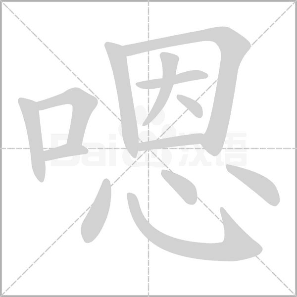 2、嗯字的部首是口,嗯字的结构为:左右结构,嗯字笔划顺序是:竖、横折、横、竖、横折、横、撇、点、横、点、斜钩、点、点。